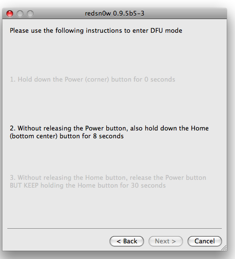 Now the somewhat tricky part. You gotta enter DFU mode by pressing a combination of the power button and the home button in a certain sequence for a certain amount of time. Its actually quite easy but just make sure you what the screen tells you. Start out by holding down the power button for 2 seconds and then at the same time the home button for